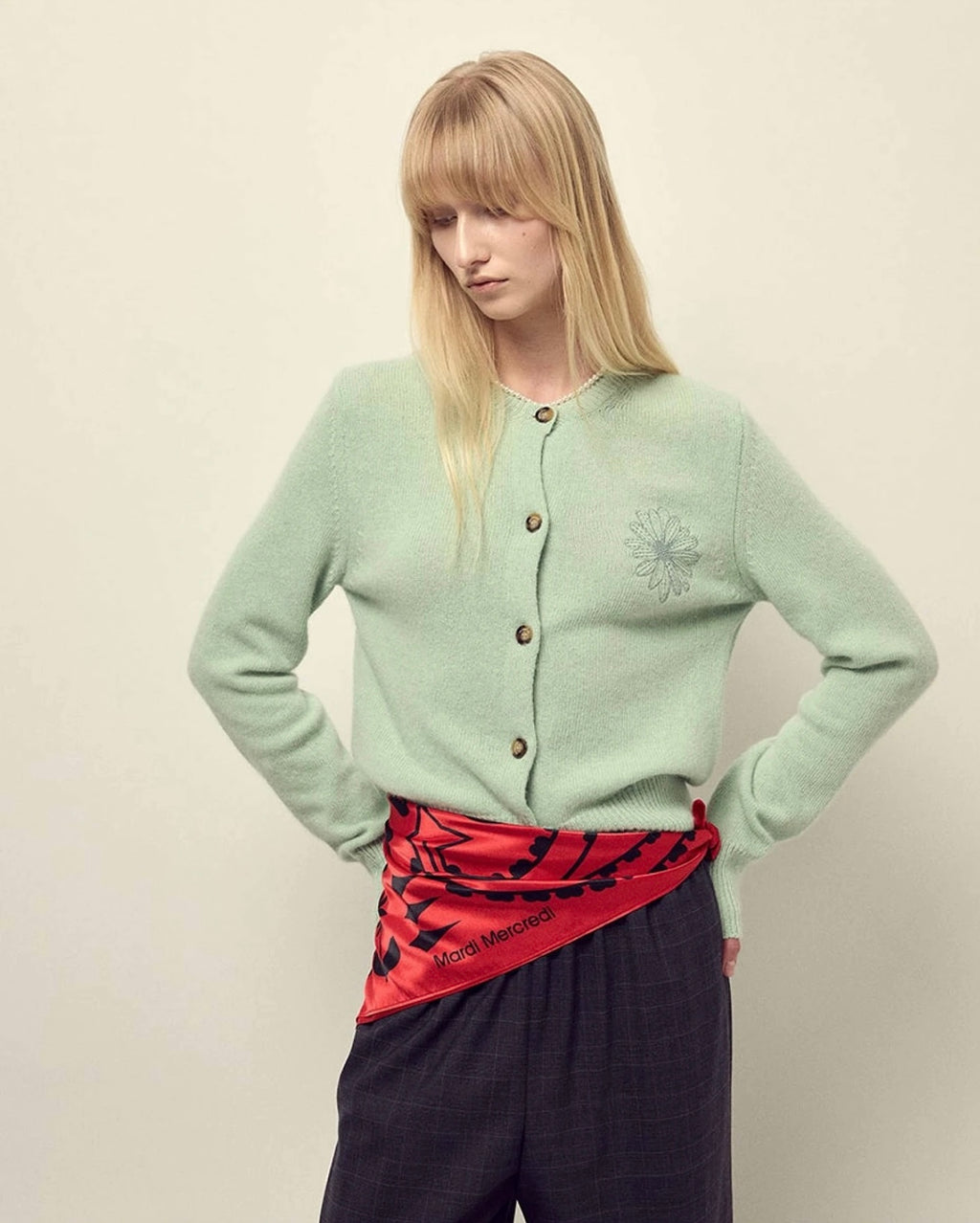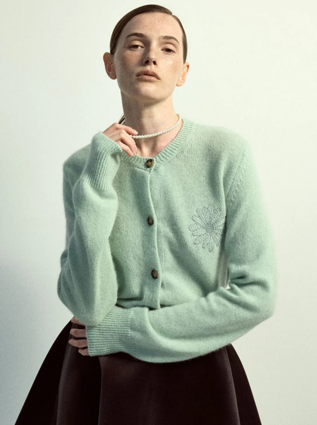 韩国Mardi Mercredi 小雏菊 毛衣 薄荷绿圆领 绿色花花