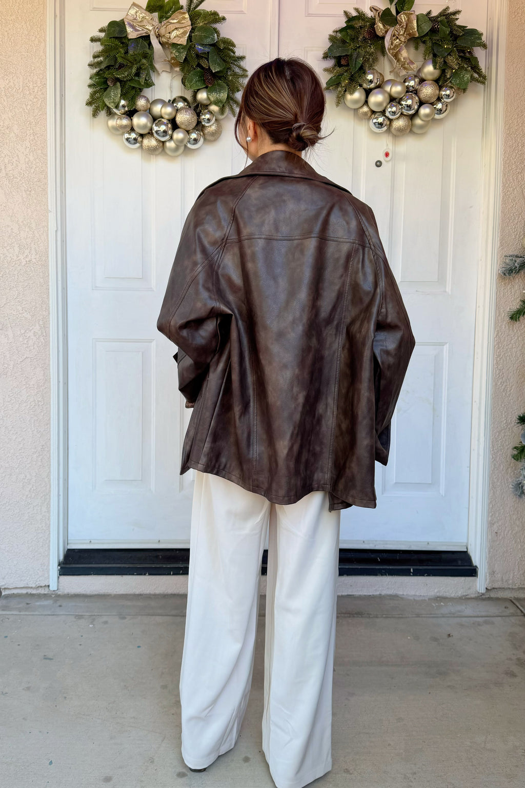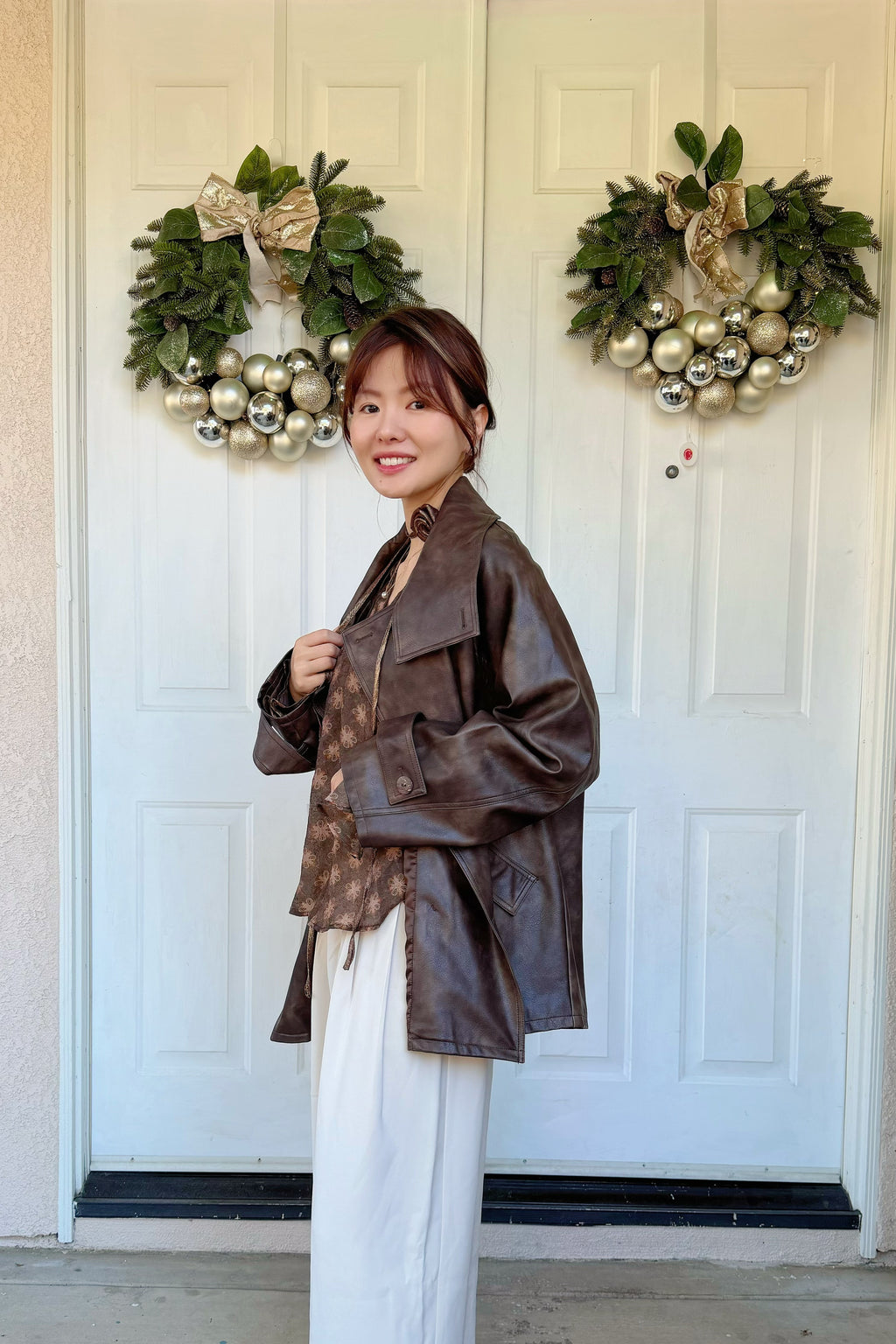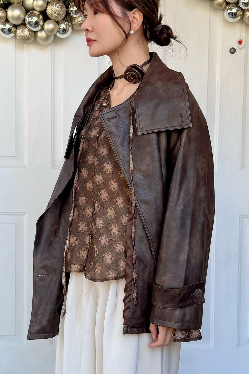 【Riko's collection】棕色水洗皮晕染感插肩袖立领皮衣外套酷酷哒