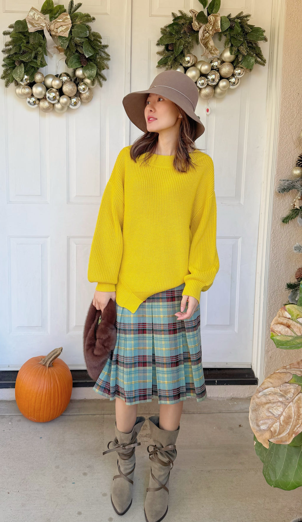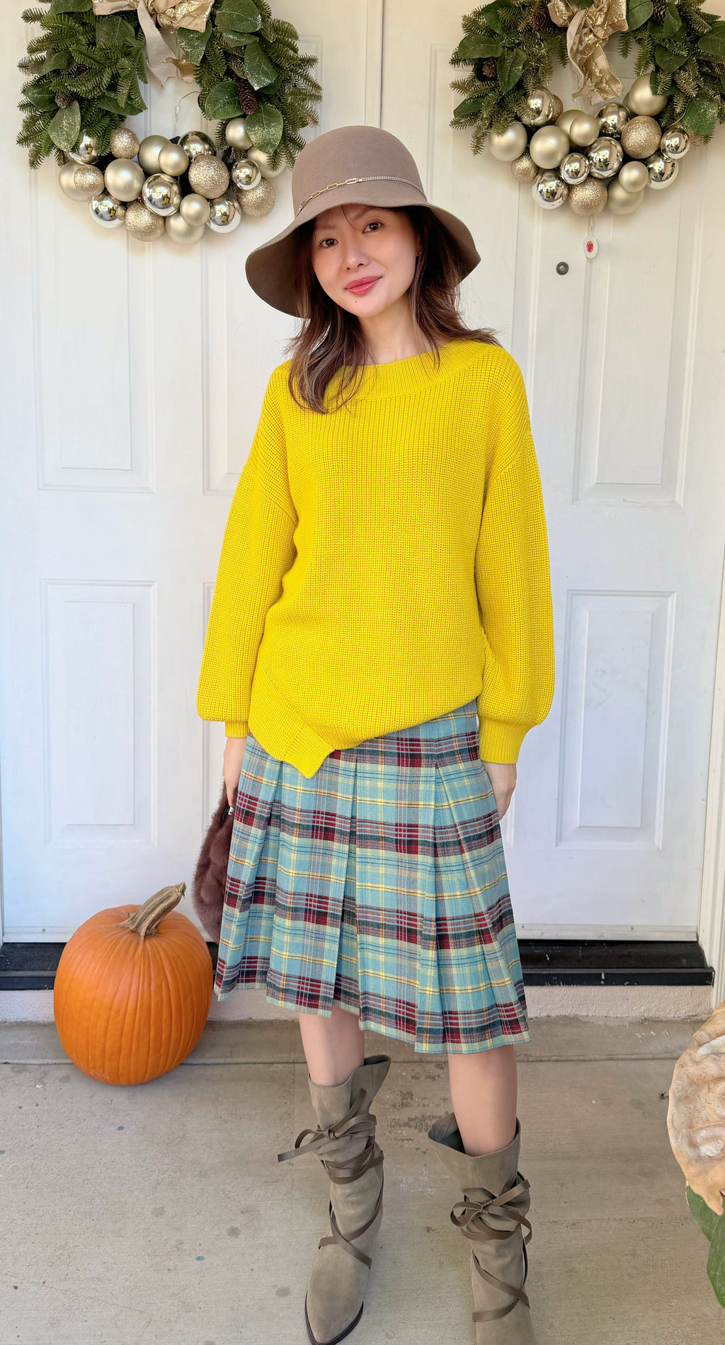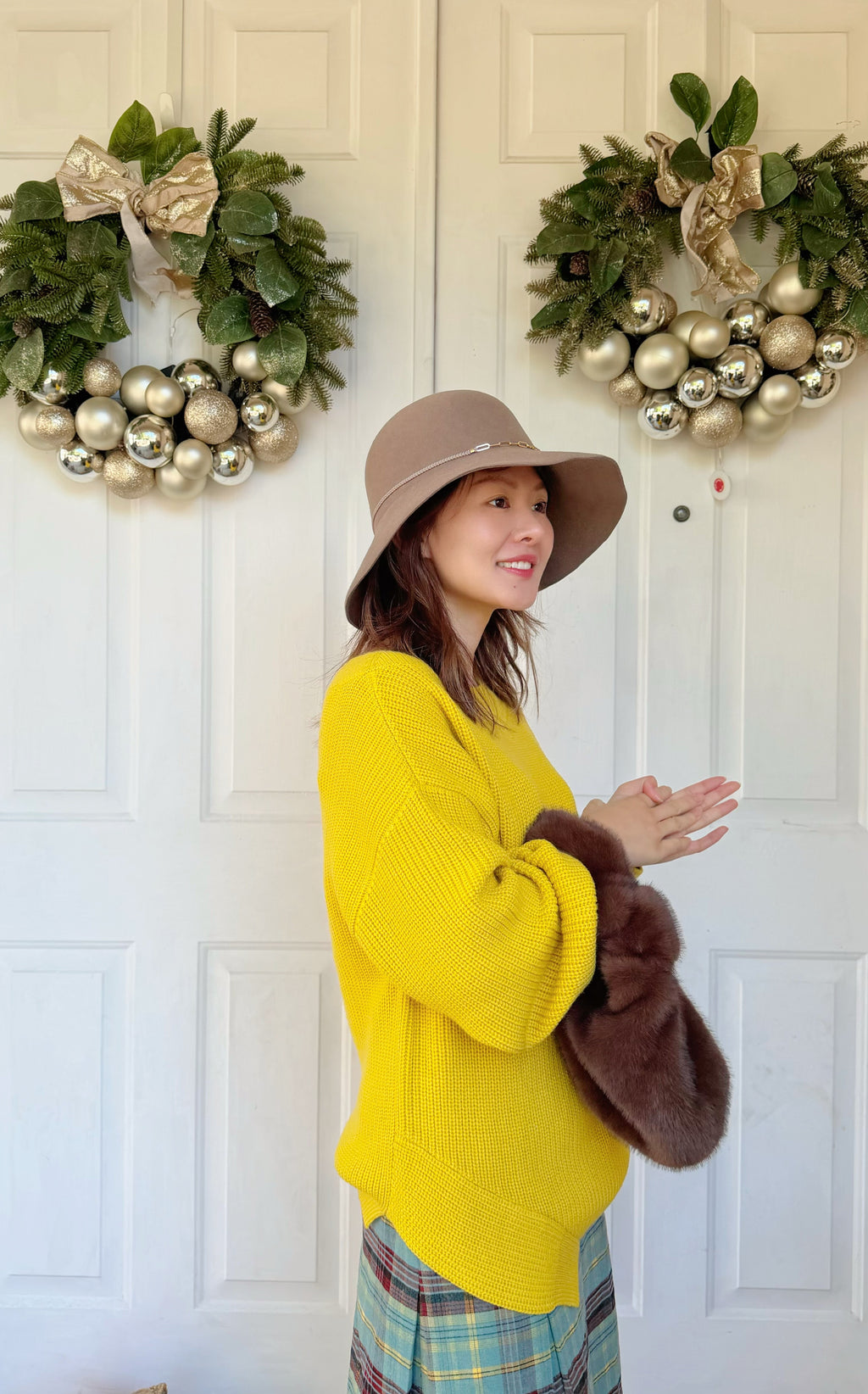 【Riko's collection】暖黄色一字肩不规则下摆绵羊毛毛衣